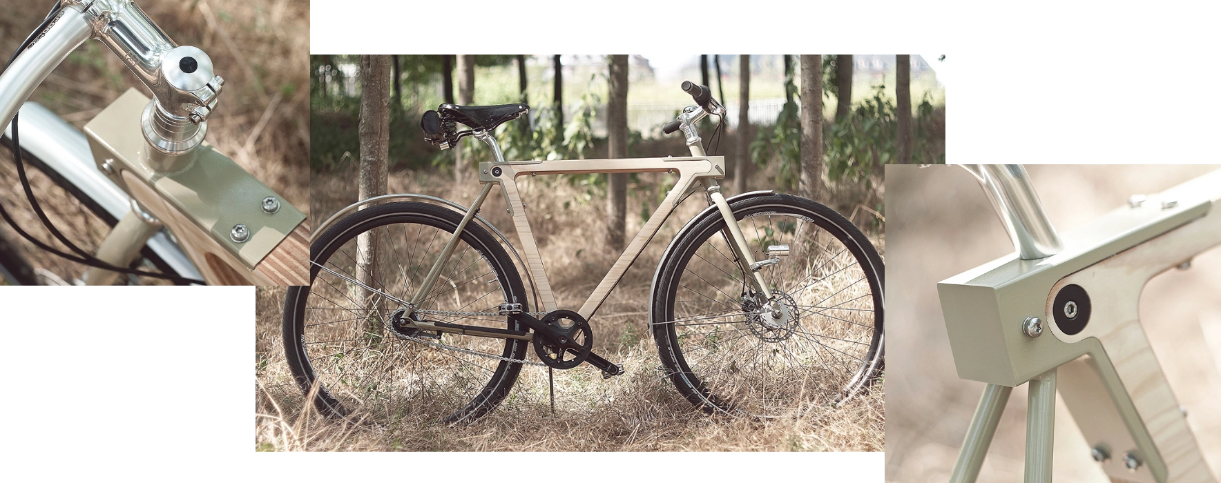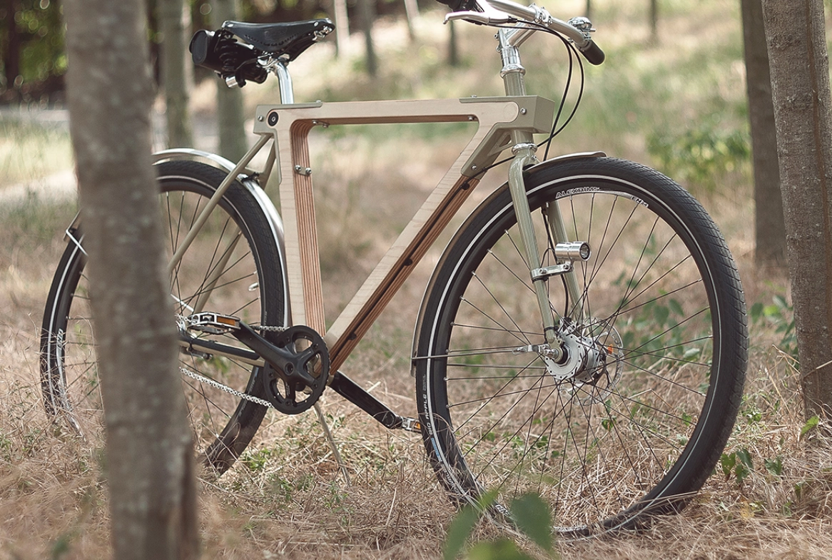 Commercialisé en 2014, le WOOD.B est décliné en quatre modèles. Son ossature, son garde-boue et son guidon sont faits en bois. Le cadre est un multiplis de frêne contrecollé issu de forêts hexagonales, l’acier provient d’une entreprise située à Toulouse et le tout est assemblé à Strasbourg. Ce qui en fait l’un des seuls vélos entièrement Made in France en bois.