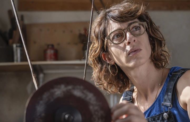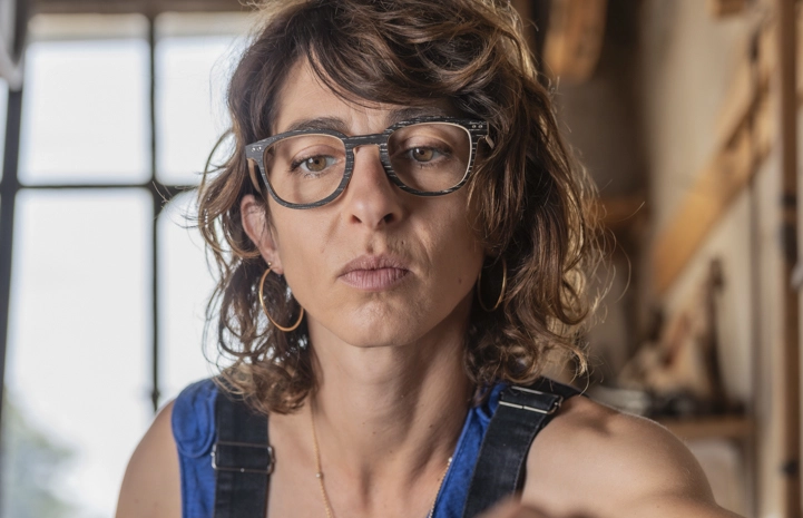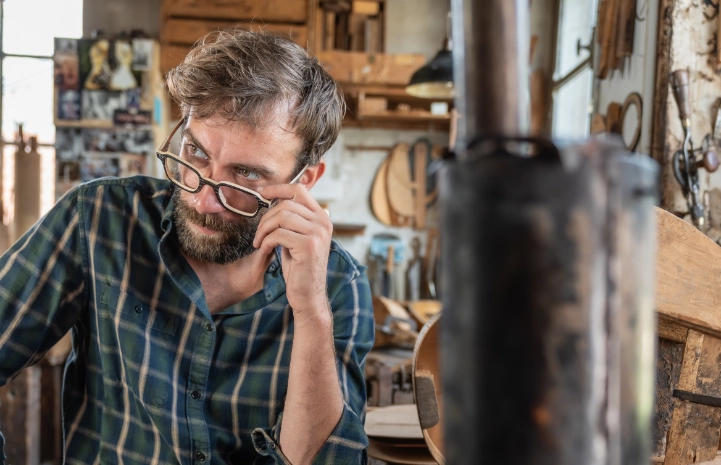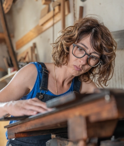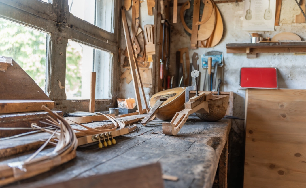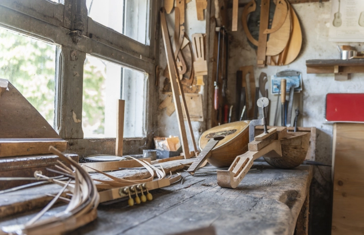 Plan de travail avec des instruments à corde en bois démontés.