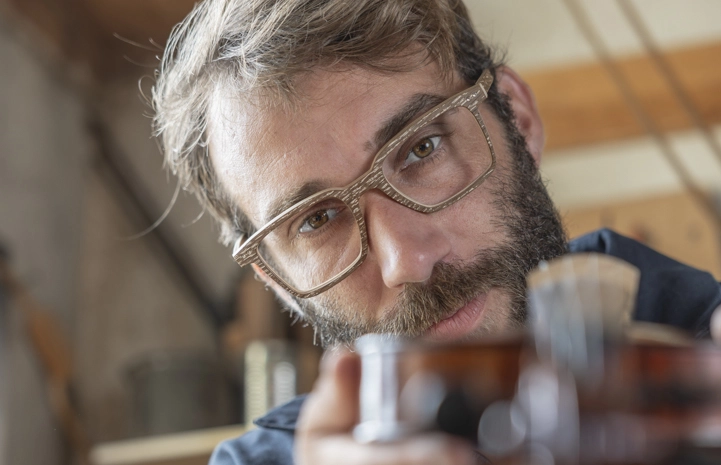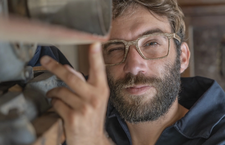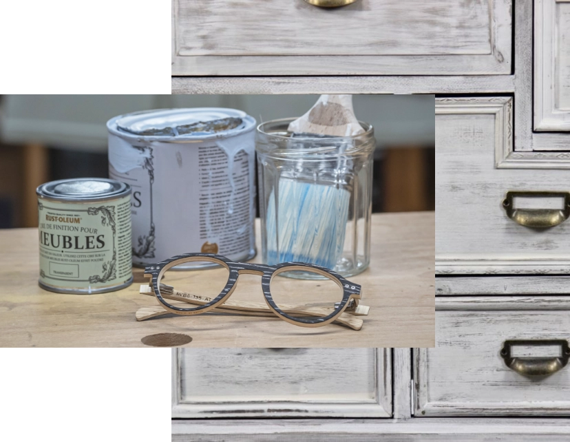 Lunettes en bois cérusé avec un pot de peinture et un pinceau